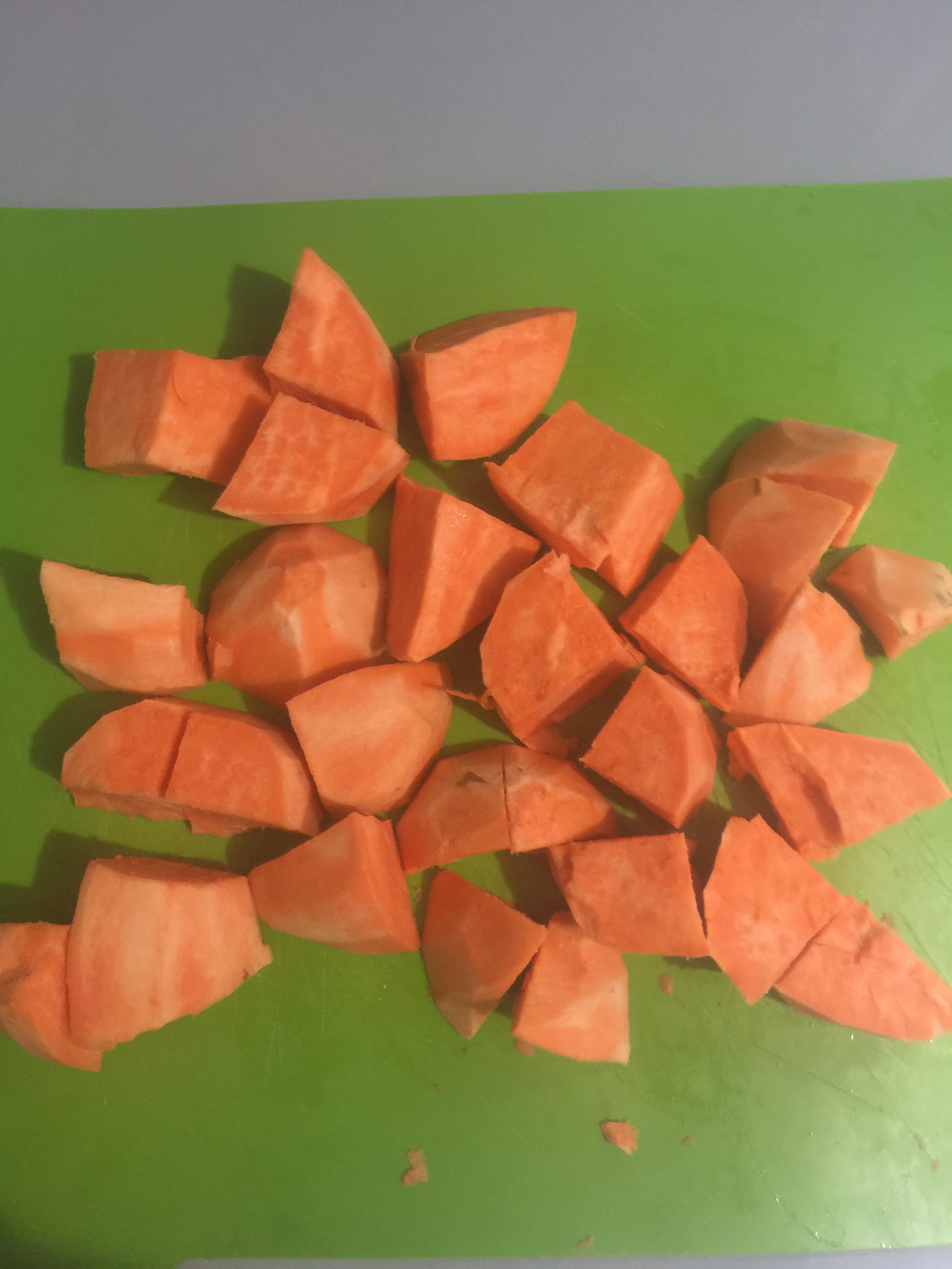 The recipe is SUPER easy! Remember the raw ground salmon from the frozen paws: salmon edition? This uses the same stuff along with 2 medium sized sweet potatoes.
