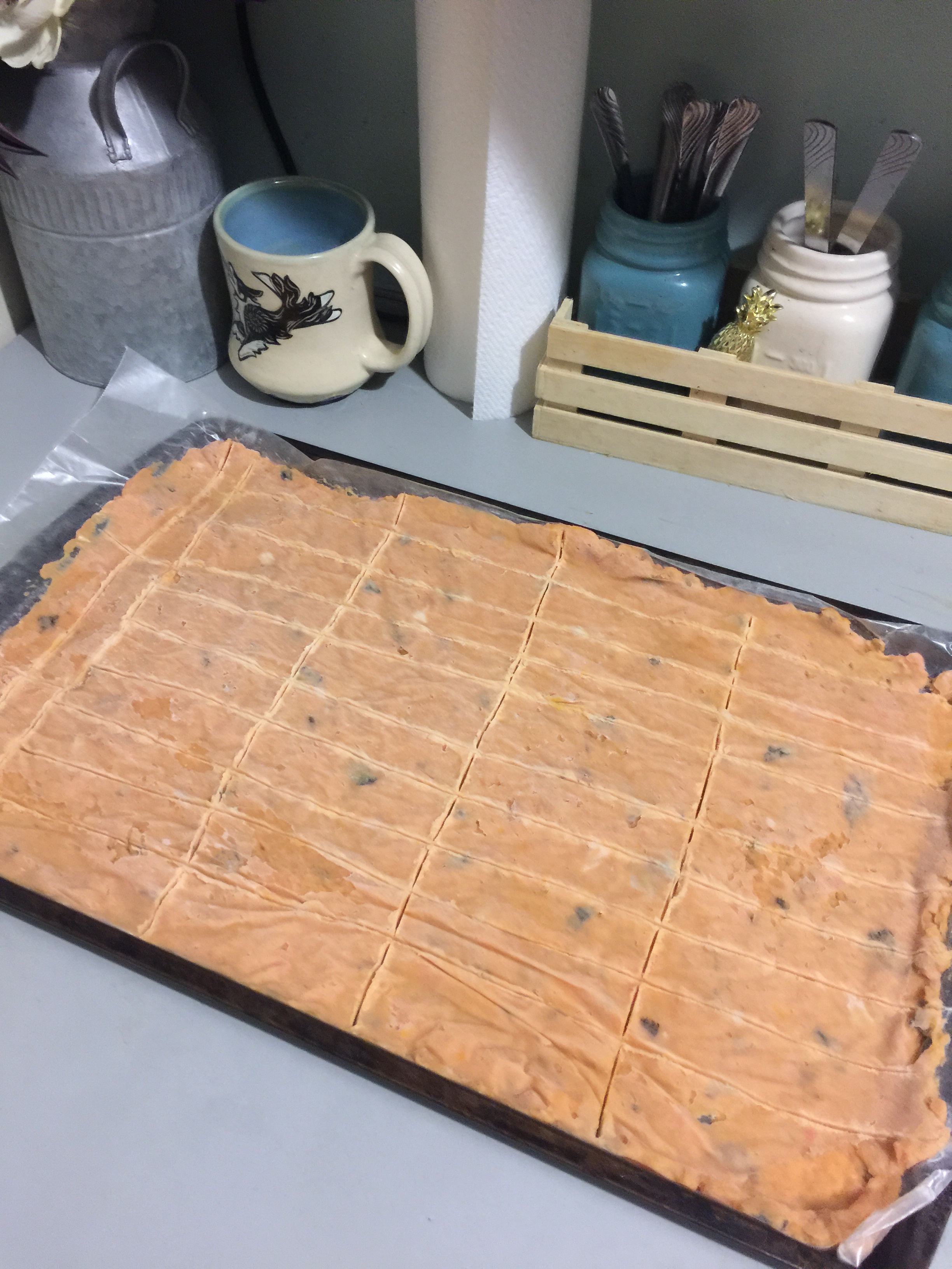 Once it was all mixed, I spread it in a thin layer on a cookie sheet and put it into the freezer for a few hours. When they came out of the freezer, I let them thaw for a few minutes, scored them in strips and broke them apart. At this point they were starting the thaw rather quickly so if you decide to give it a go just be mindful. It’s not an issue that they were thawing, it just made them harder to get onto the dehydrator trays in one piece. I like this method because it makes predictable, somewhat uniform sized pieces that look nice and make for easy storage!
