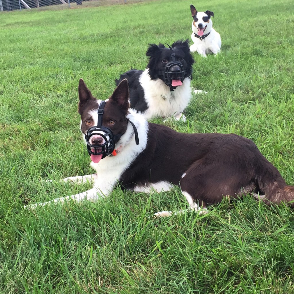 Muzzles also keep either of them from making poor decisions when they get over aroused and keep everyone safe in the event they make a poor choice. Without muzzles the boys would never be able to be out together, but with them they’re able to co-exist more or less. Always under a watchful eye but coexist nonetheless.