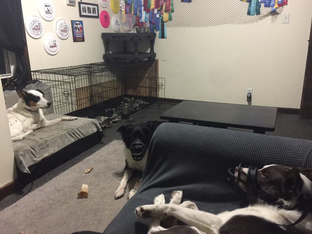 If you’ve been following along, you may remember in an earlier post mention of Rugby and Rumor not getting along. As much as I would love to say my dogs all get along great and everything is peace and rainbows in my house, it’s not. Rugby can be a bit of a control freak (read bully) and Rumor doesn’t appropriately give or read signals a majority of the time. The two just don’t mix. Which means my house has some unique rules. Crate and rotate, a house divided and muzzles are all tools used daily to keep everyone safe.