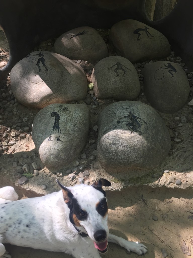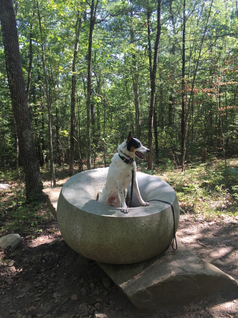 Last weekend I went with a friend to an outdoor sculpture trail in Southern NH. It was pretty cool. There were multiple trails with a variety of sculptures along them to take in and it was dog friendly, so naturally I brought along one of the boys. When it comes to picking who gets to come along on these trips, lots of things go into play but at the end of the day, Ryder’s the most bomb proof, Rumor can be a bit whiney when there’s down time (stopping to look at sculptures and/or chat), and Rugby doesn’t appreciate dogs invading his space. Now the website says, “Dogs are allowed on the property but must be under your control at all times.” Which essentially means they are not required to be on leash BUT if they are off leash they need to respond to verbal commands extremely well. I opted for Ryder because lots of people *think* their dog is reliable off leash, when in fact they are not and I just didn’t want to risk it. Turns out it was a great choice!
