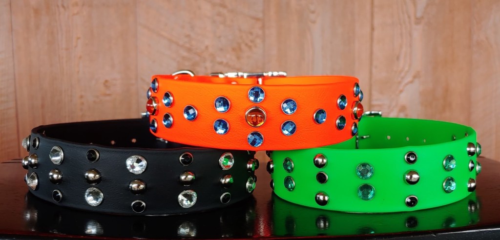 I have always said I would never pay for blinged out collars for my dogs. They weren’t worth the extra money and the boys really only wear collars when we’re out in public. You know the saying never say never? Yeah, I caved and got the boys blingy collars back in March 2020 and I LOVE THEM! They are custom designs from my brain space the multi talented Tracy Custer of Ninja Bling brought to life for me. I’ve had them for a few months, my dogs who rarely wear collars have worn them wrestling, swimming, playing disc, hanging out, hiking, and more. The collars have held up beautifully! They are rhinestones in biothane, match their limited slip collars and leashed from SpryDog perfectly and basically I’m obsessed.