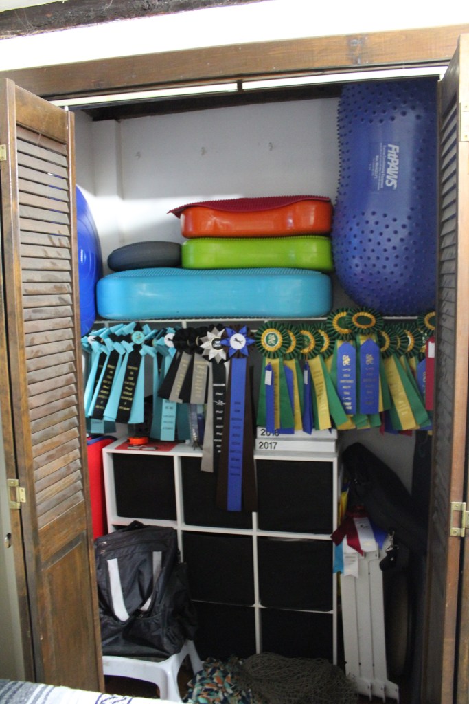 It’s not for everyone, but honestly it worked out well enough until the pandemic hit. I found I was spending all day every day in the same location in my house and it was hard to distance myself from work. This weekend I decided it was time for a change to see if I could reclaim some of my living room. My “home office” moved out of the closet and into a nook in my bedroom, the fitness equipment and discs went into the closet. That alone opened up a ton of room. I moved my Q and title ribbons into this space as well.