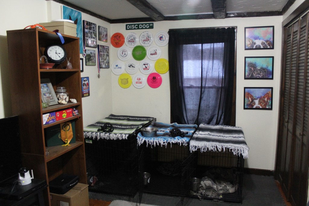 Living in a relatively small 1 bedroom apartment is an adventure in creative space solutions. Add 3 active dogs, all over 40 lbs into the mix and the adventure gets kicked up a notch. When I moved into my apartment 4 years ago, life looked very different. I only had Ryder and Rumor, which meant there were only two crates, which take up much less space than three. I rarely used my desk or desk top computer because I was working full time and didn’t have much need for them, so they were put into a closet that I could close the doors to and largely forget about. My closet office, as I called it, worked for the rare occasions when I needed desk space to work. I didn’t own any fitness equipment or discs, and my training indoors was relatively minimal.