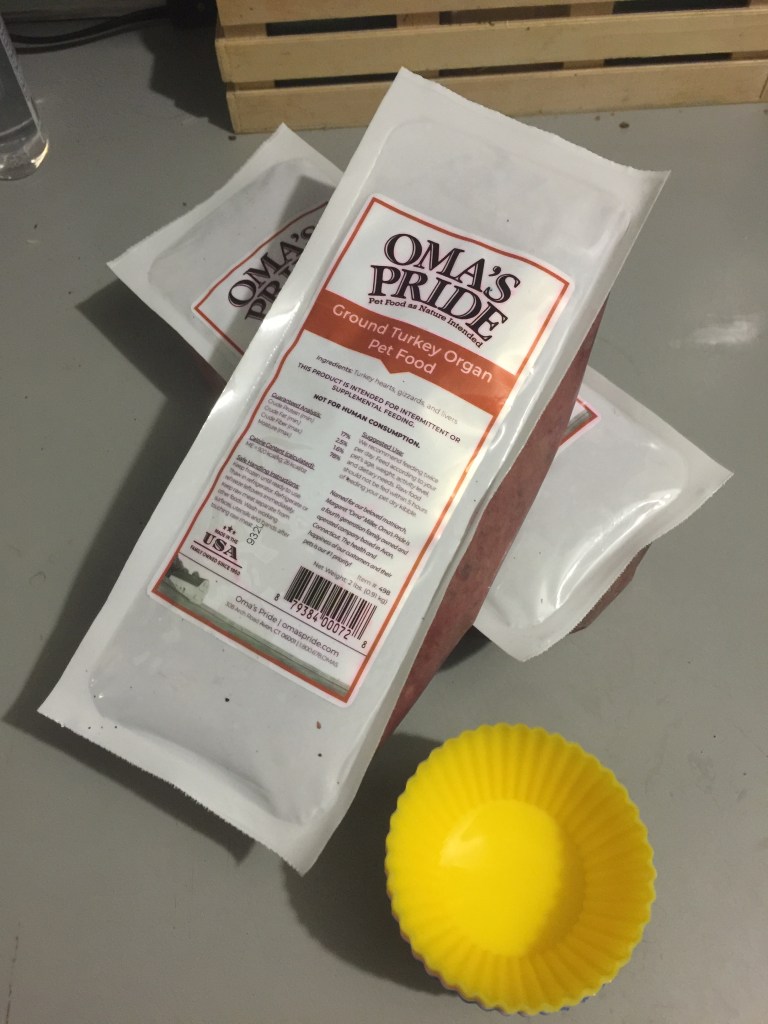 This time I used a ground turkey organ mix that includes liver, heart, and gizzards from Oma’s Pride, but I’ve also used chicken organ mix and beef organ mix in the paw prints and they all worked great.